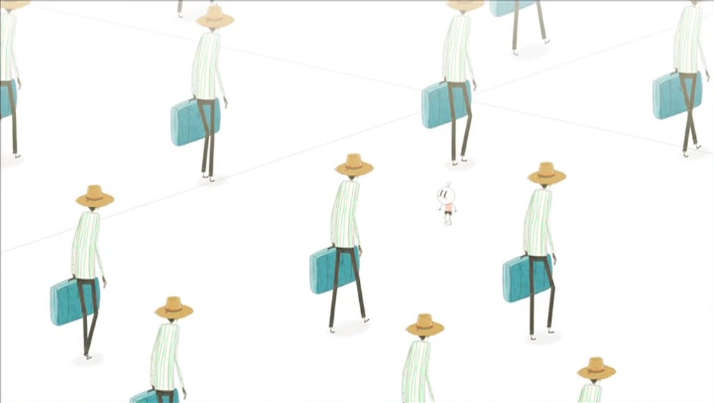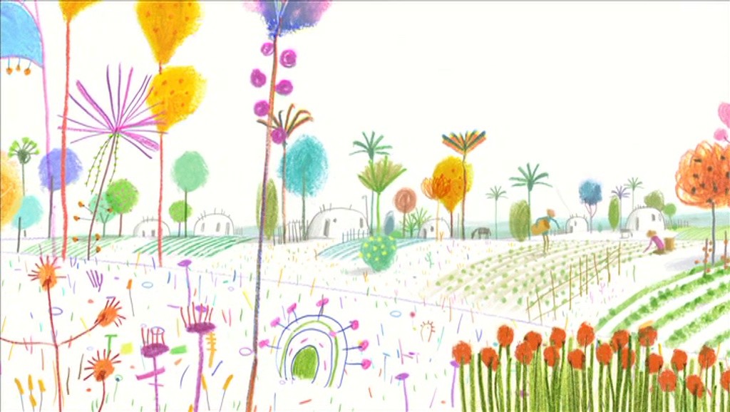 Sur une planète qui ressem­ble à la Terre, un petit garçon vit heureux entre ses par­ents et la nature qui entoure leur mod­este mai­son. Un jour, son père prend un train qui l’emporte au loin, à la recherche d’un tra­vail. Souf­frant de son absence, le garçon part à sa recherche. Des plan­ta­tions aux usines, de la méga­pole aux bidonvilles, l’enfant fait tour à tour la ren­con­tre d’un vieux paysan et de son chien, d’un jeune ouvri­er-tis­serand qui est aus­si musi­cien des rues. Il décou­vre les dif­fi­ciles con­di­tions de vie de ceux qui ont suivi le même chemin que son père. Plusieurs fois, il croit recon­naître celui-ci. Mais dans ce monde où règ­nent la con­som­ma­tion, les médias et les mil­i­taires, tous les hommes finis­sent par se ressem­bler sous leur masque de fatigue et de tristesse. Heureuse­ment, des notes de musique, pareilles à celles que son père jouait à la flûte, lui font aus­si crois­er la route d’une foule mul­ti­col­ore et nomade dont la gaîté se trans­forme en un fan­tas­tique oiseau géant por­teur d’espoir. Au bout de son voy­age, le garçon qui est devenu adulte, revient à la mai­son de ses par­ents. La graine qu’il avait semé enfant est main­tenant un arbre. Il n’a pas trou­vé son père. Mais une vie nou­velle ani­me la cam­pagne alen­tour où les hommes sont revenus cul­tiv­er leur terre.